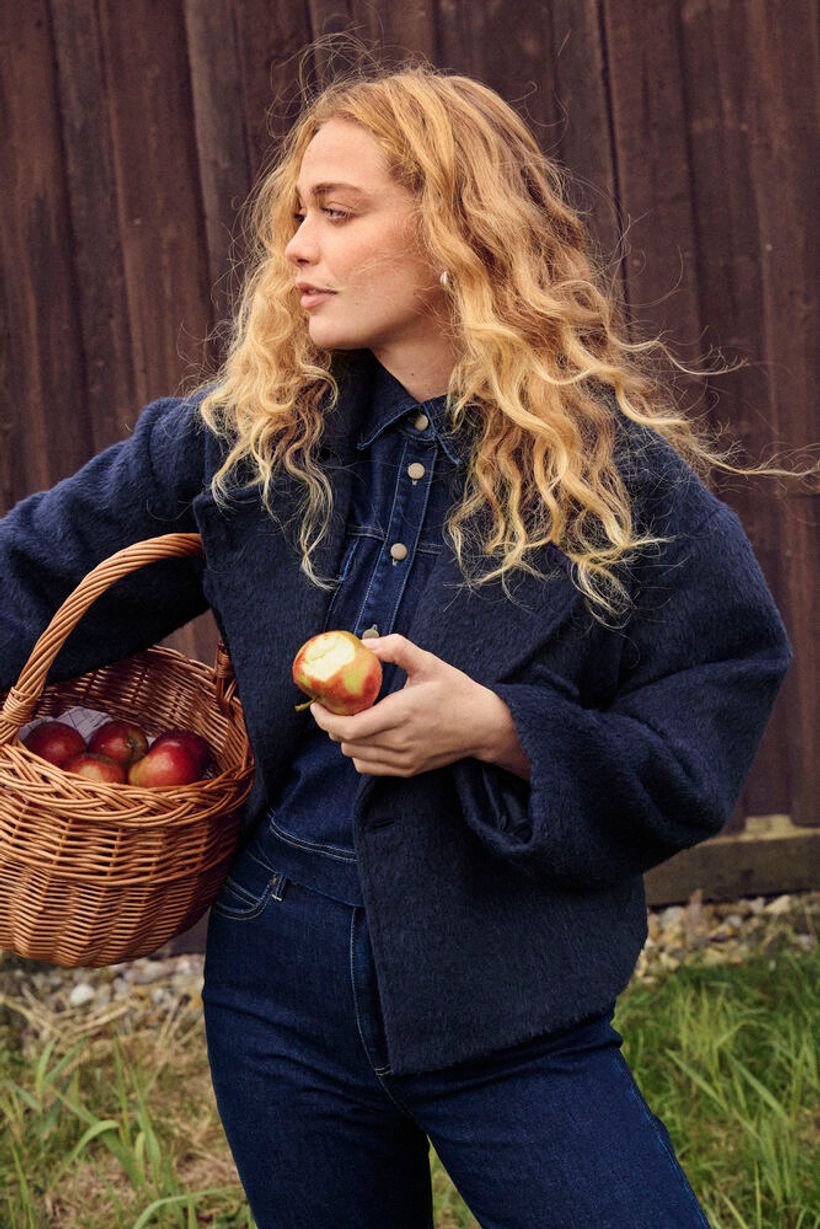A dark navy short wool-blend jacket with a double-breasted front and wide lapels. Features buttoned cuffs, structured shoulders, and a boxy fit.