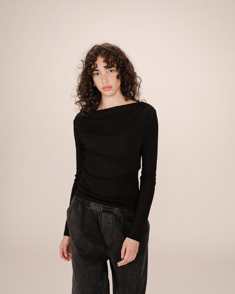 The SIOUX long-sleeved top is a piece with clean, minimalist lines that create a modern silhouette. The fitted cut is enhanced by an asymmetrical drape at the waist and shoulder, adding a graceful sense of movement. The SIOUX draped top features a boat neckline and a flattering slim fit.