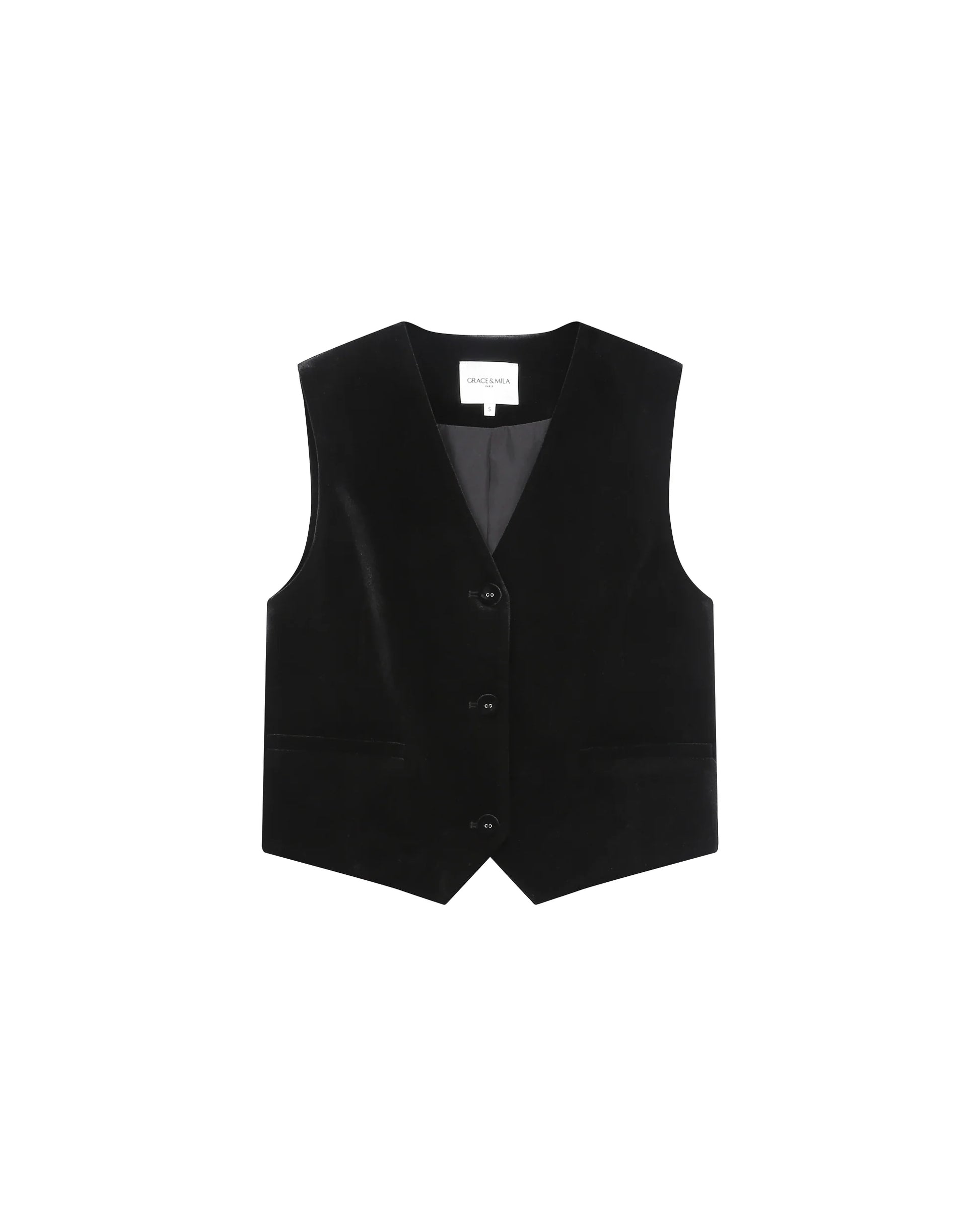 The straight cut of the TOTEM velvet vest structures the silhouette, while the V-neck adds a touch of femininity. The waistcoat features a buttoned front and two welt pockets on the front.